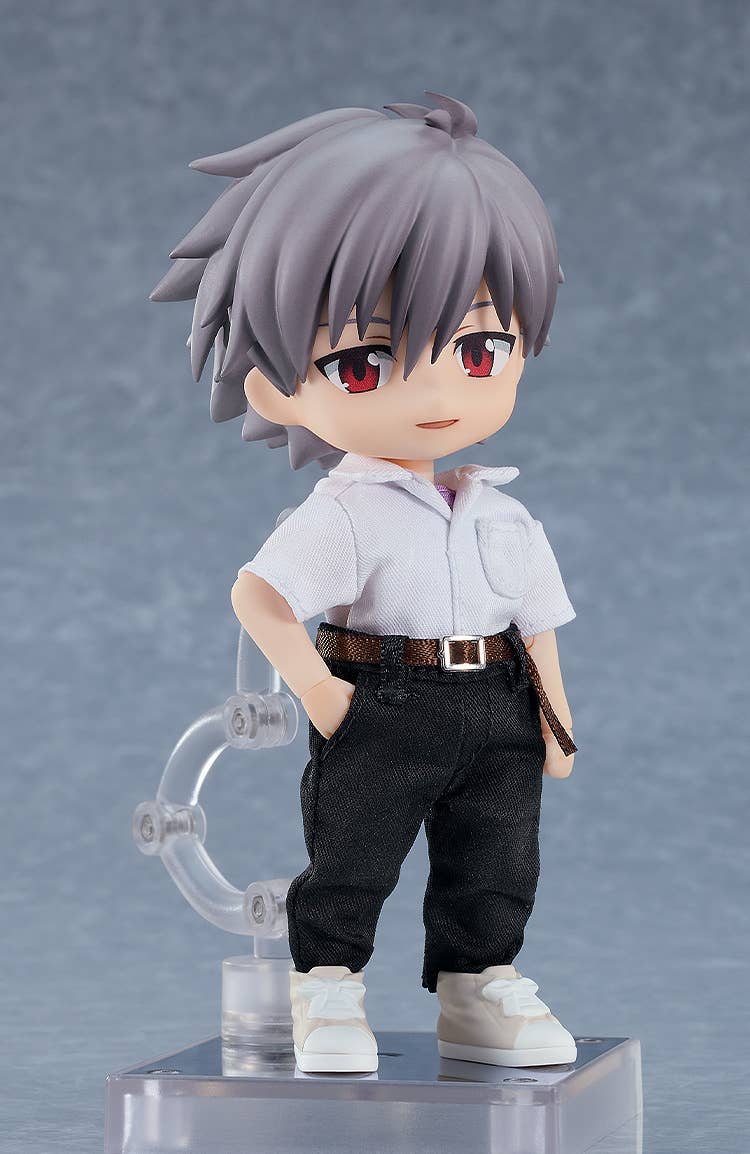 Kaworu Nagisa from Rebuild of Evangelion joins the Nendoroid Doll series wearing his school uniform. Features the familiar Nendoroid head on a fully poseable doll-style body, with fabric clothing and magnetic shoes for easy posing and display.
