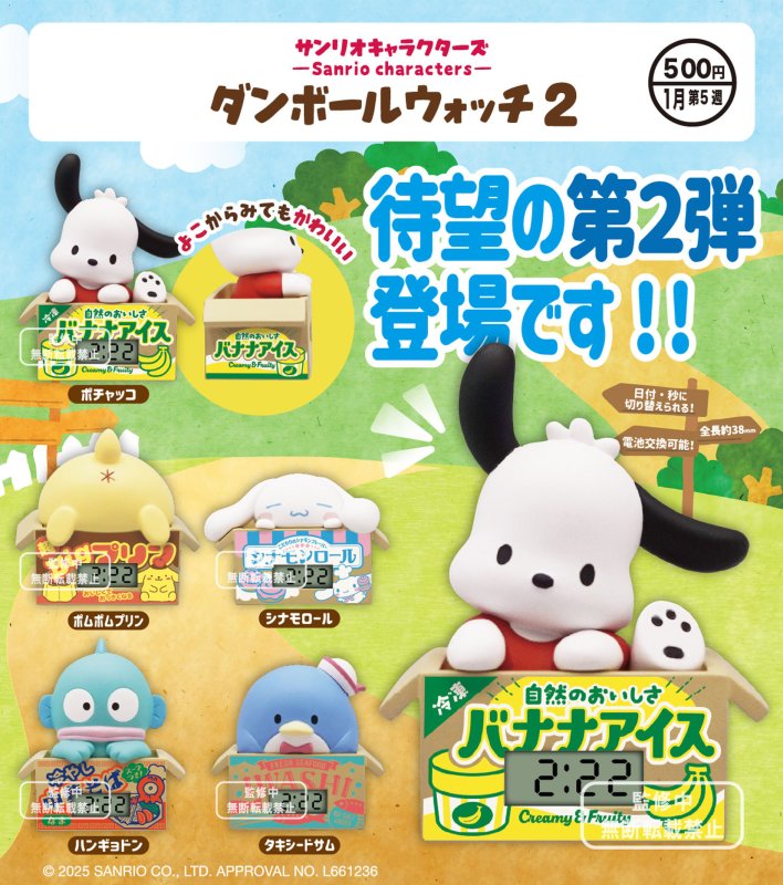 Your favourite Sanrio characters have turned their cardboard boxes into tiny clocks. This playful gachapon series features characters lounging in colourful snack-themed boxes that double as miniature digital watches.