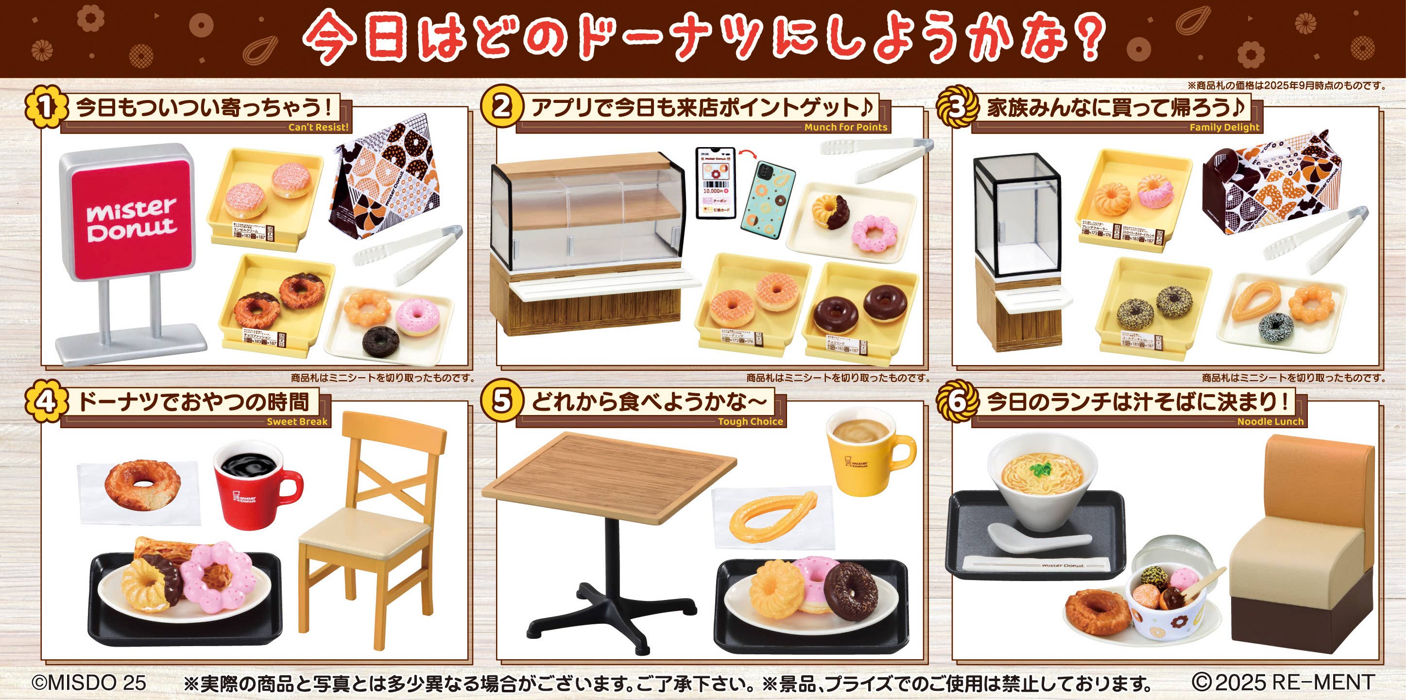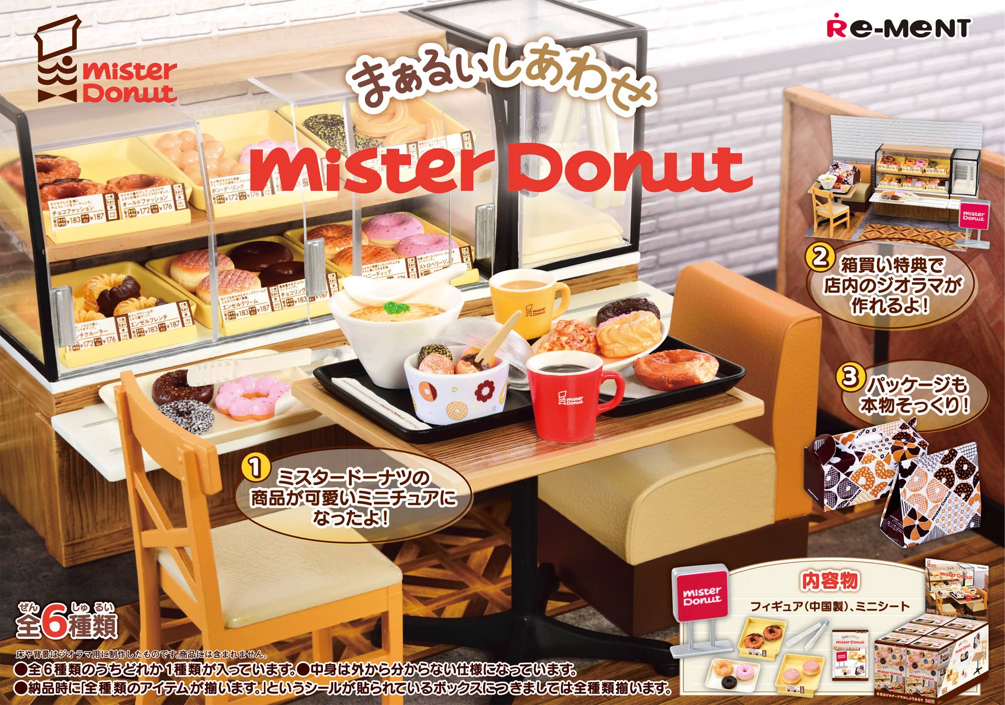 A fun miniature blind box from the Re-Ment × Mister Donut collaboration. Each box includes one random scene, featuring delicious-looking donuts and accessories you can arrange on shelves or place into paper boxes.